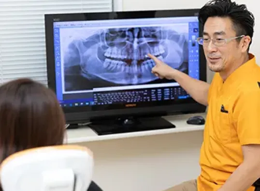 ご納得いただいてから治療を開始します私の願いは、患者様ご自身でセルフケアの意識をもっと高めて貰いたい!ということです。 毎日通院出来るわけではないので、一回一回の診療に気を遣っています。 不安なく診療を受けて頂くために、患者様のお口の状態をご自身で知って頂くこと、どんな治療をするのかよく知って頂くこと。 それが重要だと思っておりますので、レントゲン画像やわかりやすい写真を用いて、説明するようにしています。 歯科医師じゃないとわからないではなく、患者様に気付きを与えられるように、意見や思いを尊重しながら診療しています。