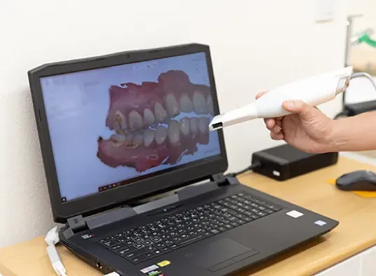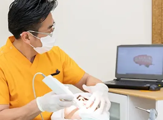 型取りせず詰め物・被せ物を製作致します当院で新しく導入した口腔内スキャナー「TRIOS®3」は、口腔内を細部まで精密にスキャニングできる機器です。 ご自身のお口の中を、患者様にわかりやすくお伝えすることができるだけでなく 詰め物や被せ物をする際の、パテ状の型取りが不要になり、感染症の軽減や嘔吐反射を起こしやすい方などの負担を軽減します。 歯型を取る時に「印象」と呼ばれる柔らかい素材を使用したことがある人も多いのではないかと思います。 近年の印象は不快感が少なくなってきたとはいえ、抵抗のある方も多いのではないでしょうか。 やち歯科医院で導入しているTRIOS オーラルスキャナは小さな口腔内カメラでフルカラー、3Dで撮影する事が出来ます。 チェアタイムも短くなり、印象の負担も軽減されるため、当院では積極的に利用しております。 他にも被せ物や詰め物などは、自然の歯の色に近づけるために一般的にはシェードと呼ばれる「歯の色見本」を使用して目視で作成しますが、 TRIOS オーラルスキャナのシェード機能を利用すると、莫大なデータからコンピューターが正確な色を算出し、被せ物や詰め物などの制作に素早くかつ、正確な情報を得ることが出来ます。 他にも口腔内カメラとしての機能も優秀です。矯正の歯を動かす距離や角度をCTと重ねて診断、診療することが可能です。